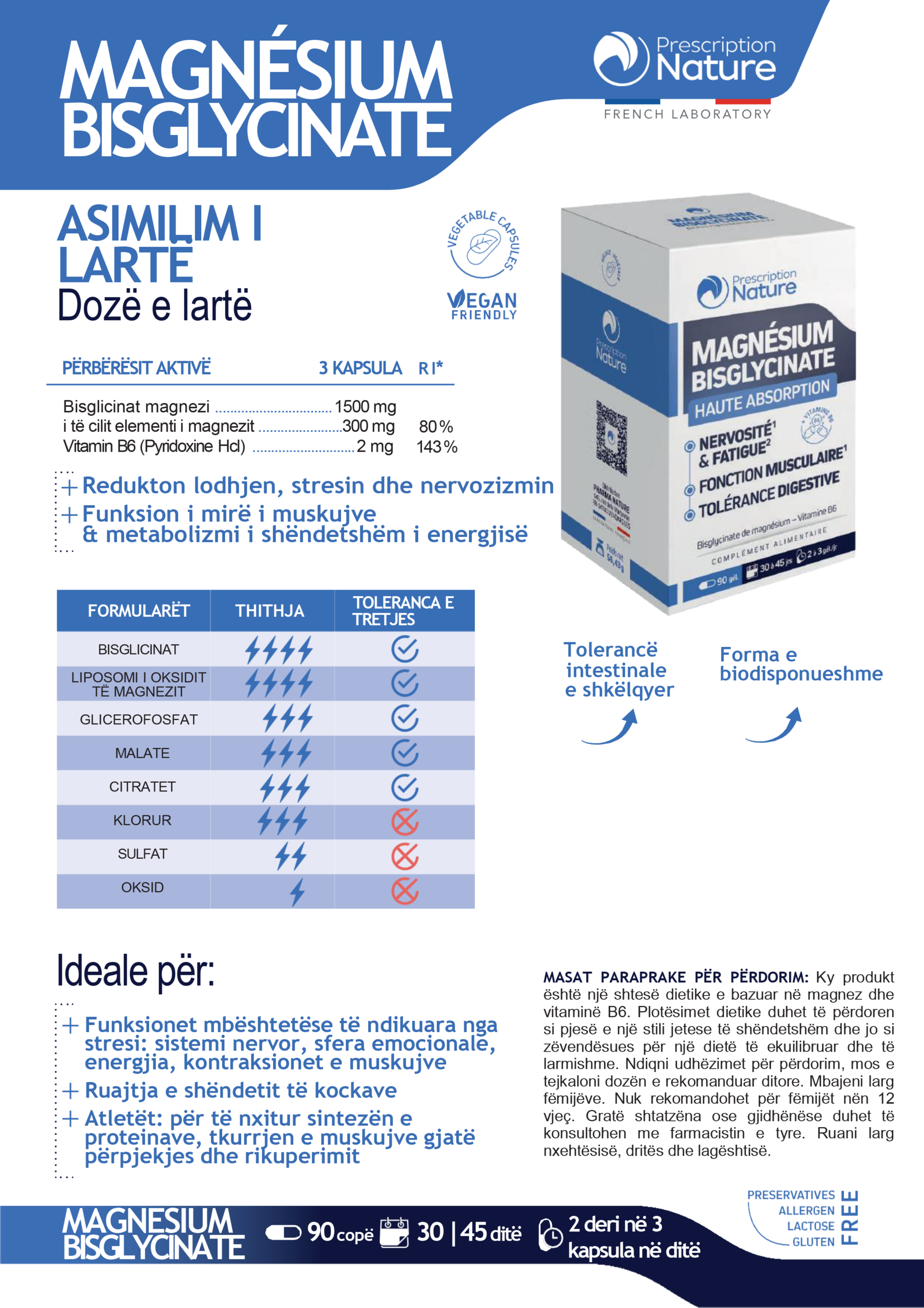 Prescription Nature Laboratories ofron një formulë inovative me bisglicinat magnezi, i njohur për biodisponueshmërinë e tij të lartë. Magnezi ndihmon në uljen e lodhjes dhe kontribuon në funksionin normal të muskujve dhe metabolizmin e energjisë. Ky suplement përmban vitaminë B6, e cila rrit veprimin e magnezit. Kombinimi i këtyre dy përbërësve ofron mbështetje optimale për ruajtjen e vitalitetit tuaj të përditshëm.